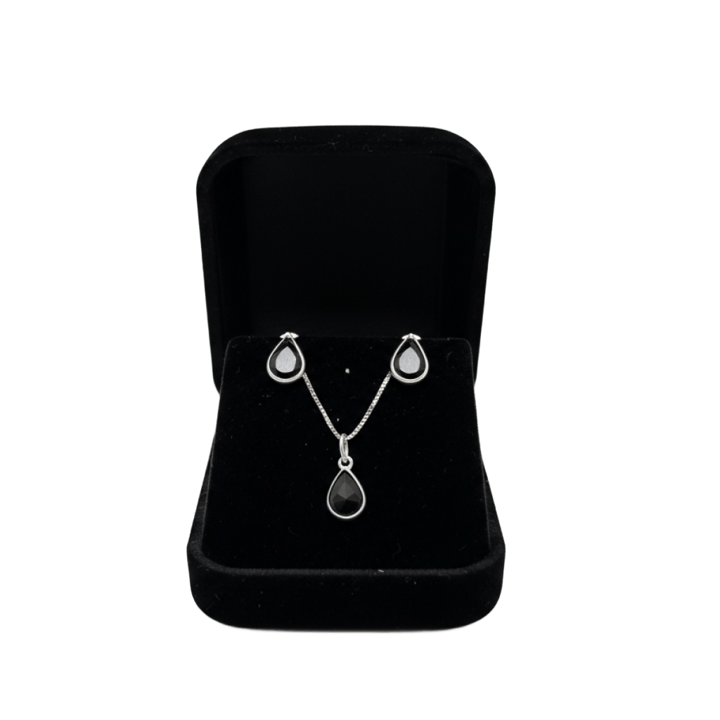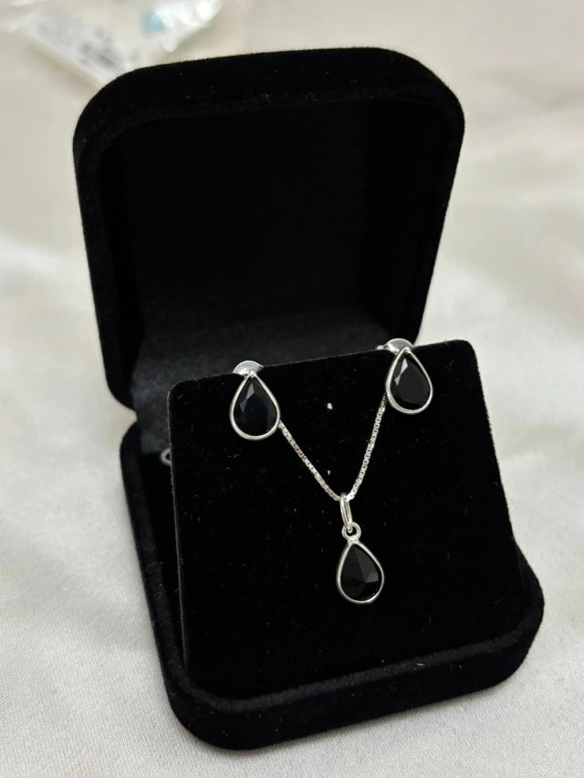 Com um design elegante e versátil, o Conjunto Emilly destaca-se pela combinação única do brilho sutil da prata com a intensidade da pedra preta, ideal para complementar qualquer look com charme e personalidade.